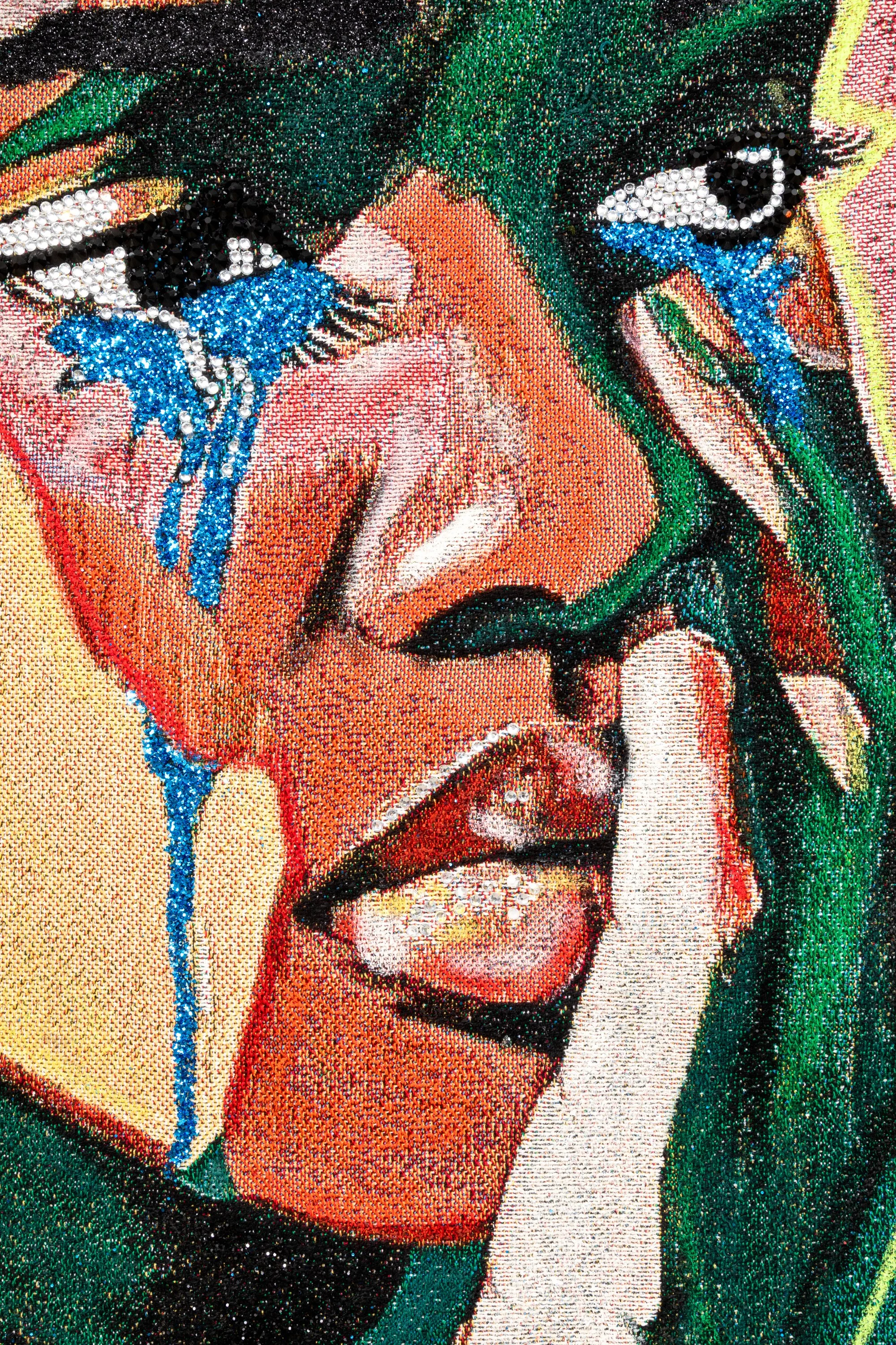 The concept of ‘masking’ emerges as a central gesture in the layered surfaces of the face and body. In several of the works, color bisects the figure—green across one side of the face, yellow or pink across the other—intended to evoke the subtle labor of self-editing: what is shown, what is hidden, what fractures under the pressure of being constantly perceived. Tears appear with painterly emphasis, but they are not singularly about sorrow; they mark release, rupture, and reclamation. They reveal what happens when the mask briefly slips and the interior becomes visible.