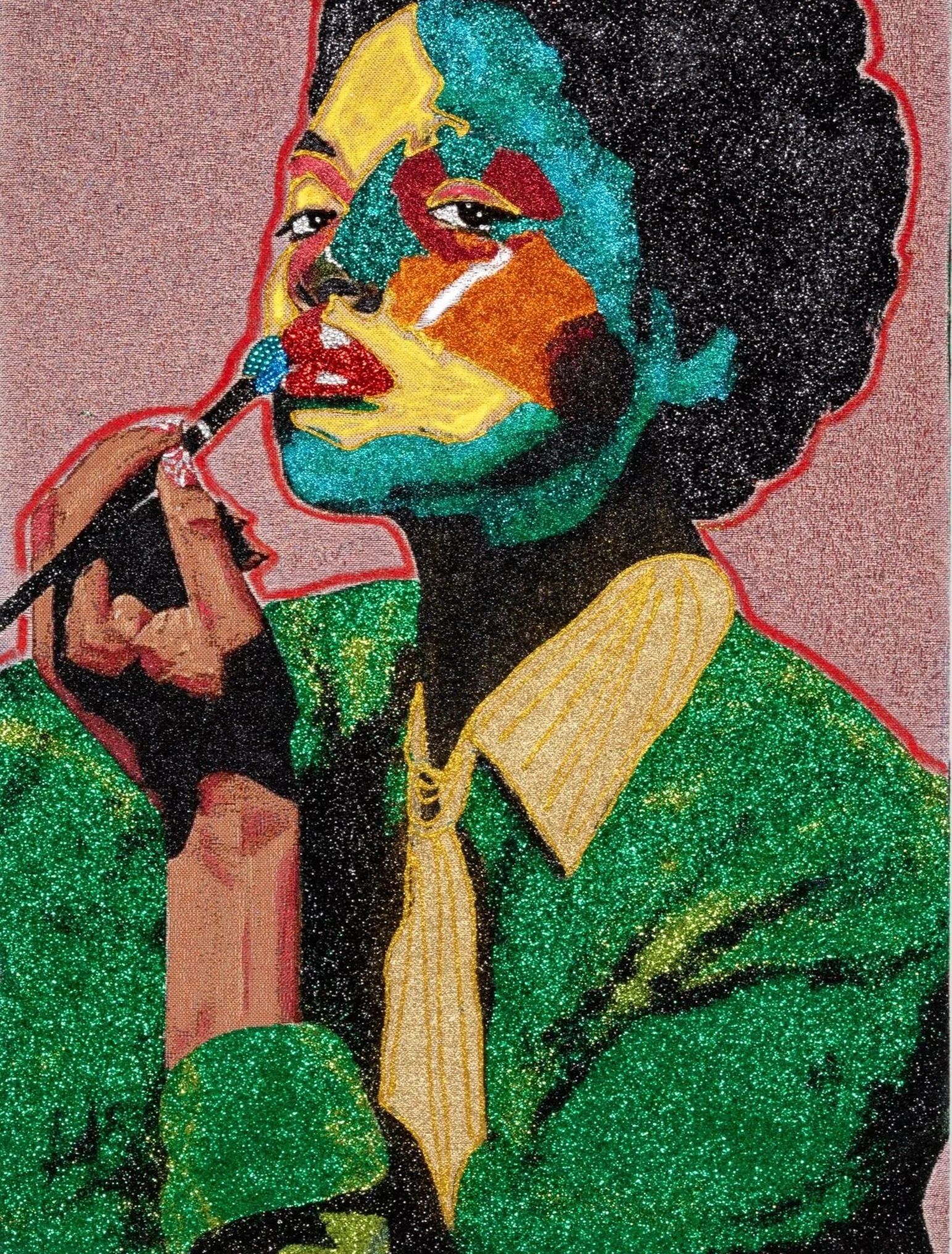 Jacquard, glitter, adhesive, rhinestone, oil stick, screws, leather on wood panel