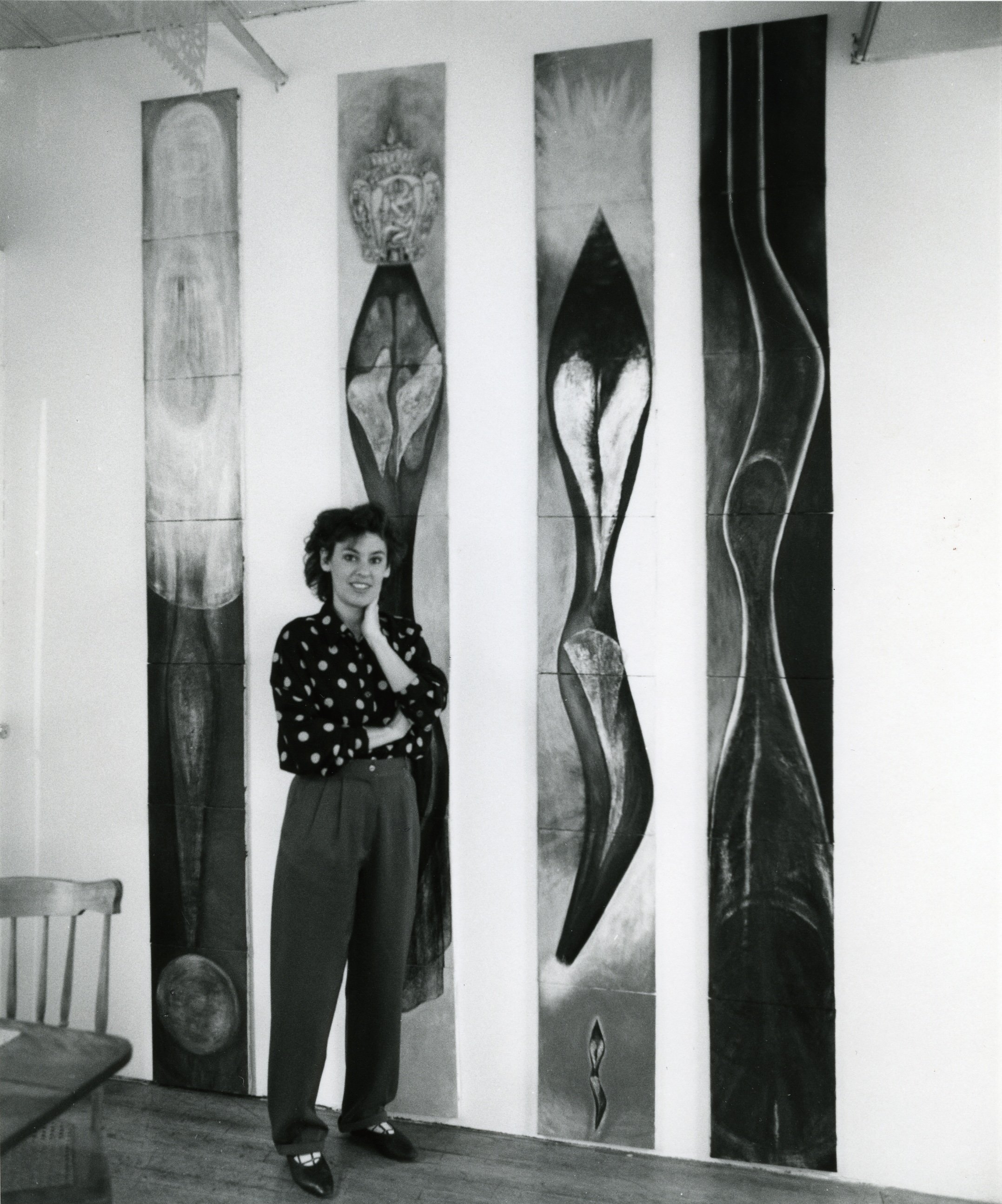 Portrait of Mira Schor in her studio, 1986. Photo by Sarah Wells