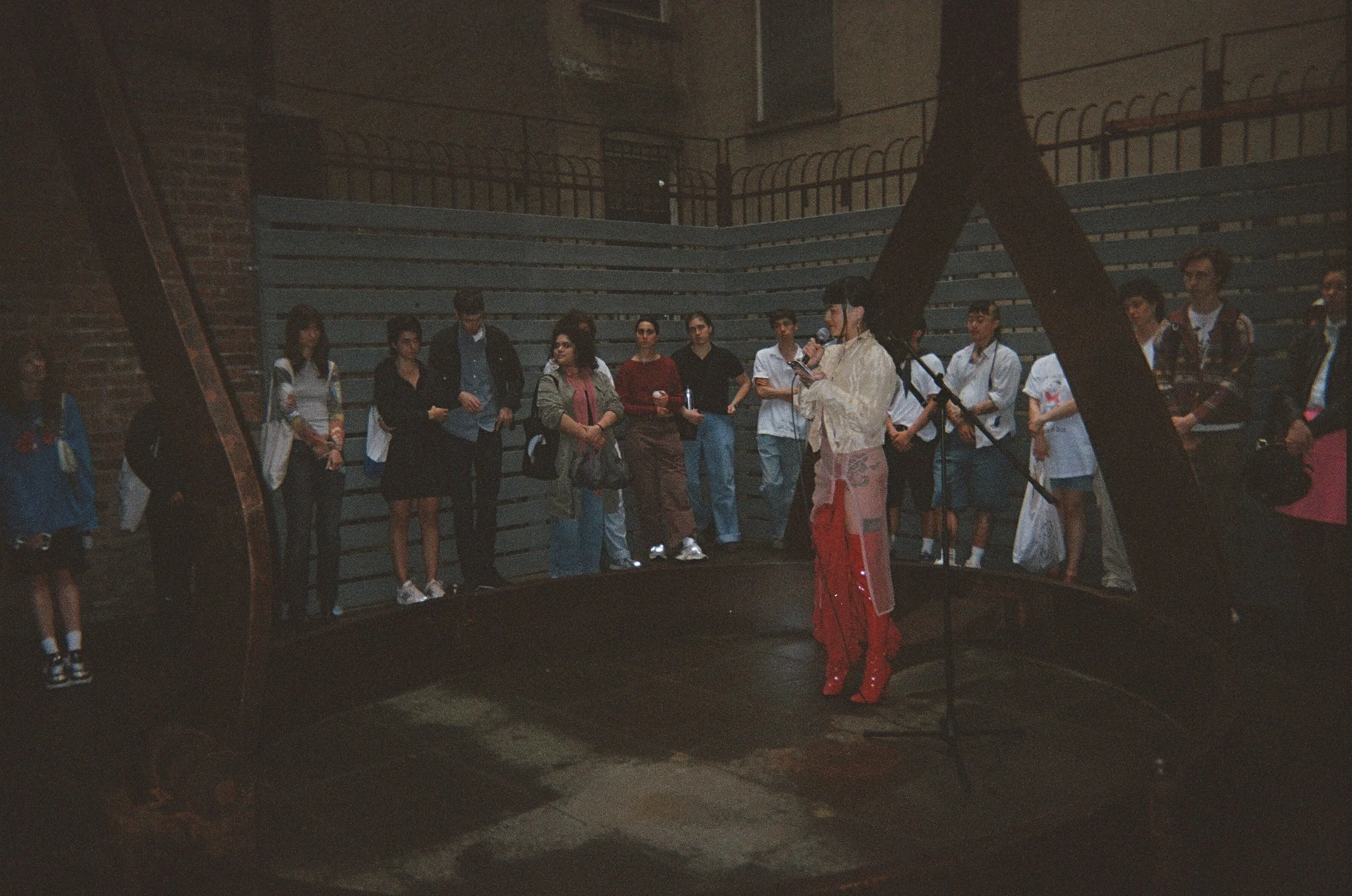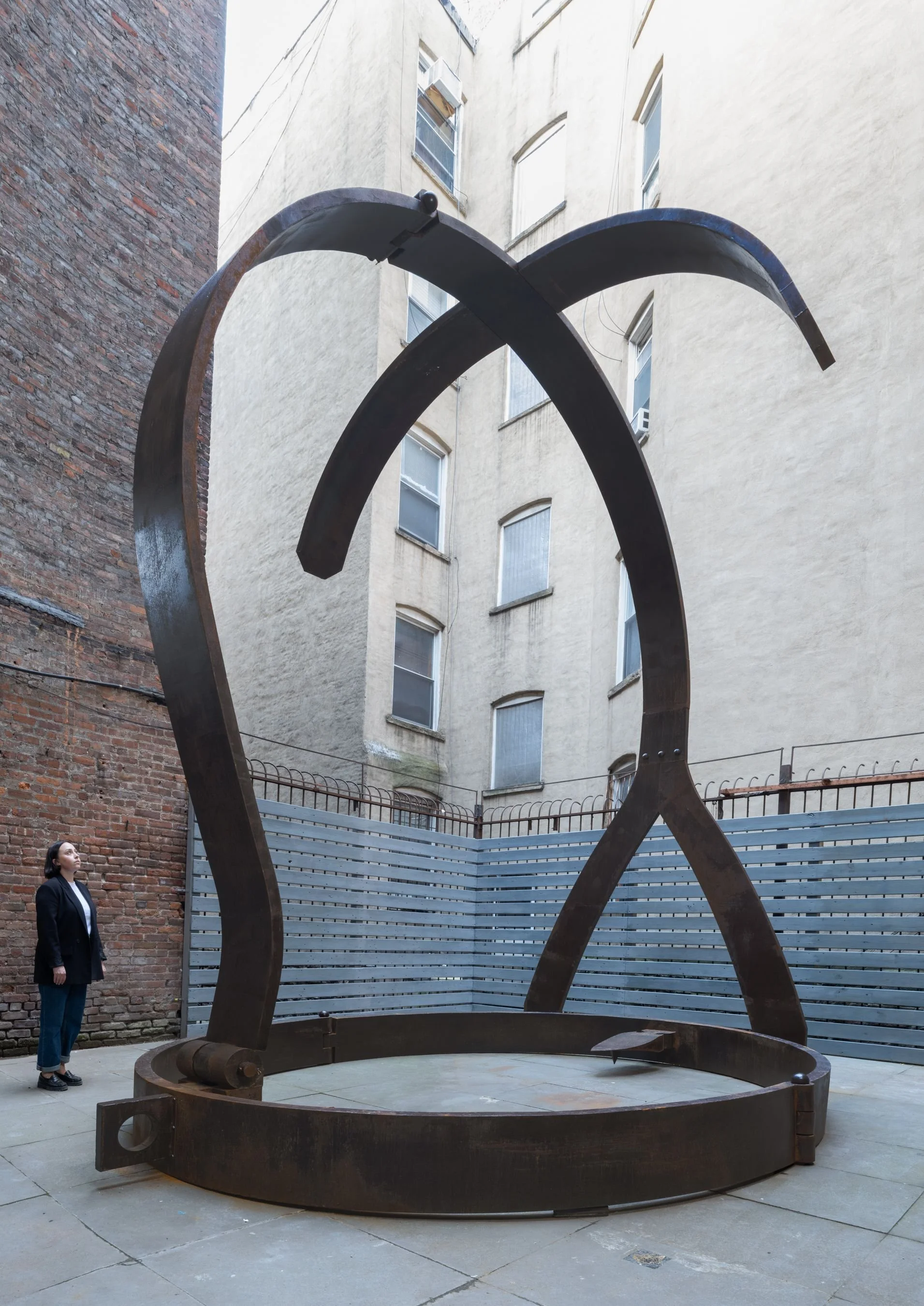 Brank is a 16-foot tall monumental sculpture that takes the form of a scold’s bridle, an instrument of public humiliation and punishment created in the 16th century and used on women who were perceived as troublesome for speaking out of turn. A spiked bridle-bit was forced into the captive’s mouth so that any attempt to speak would inflict injury. In some instances, the women were led around their cities by a leash, furthering Ouyang’s exploration of the relationship between dog, or submissive, and master in their work, On May 18, 2024, Brank served as a stage for readings, reinstating voice in the once-muted space.