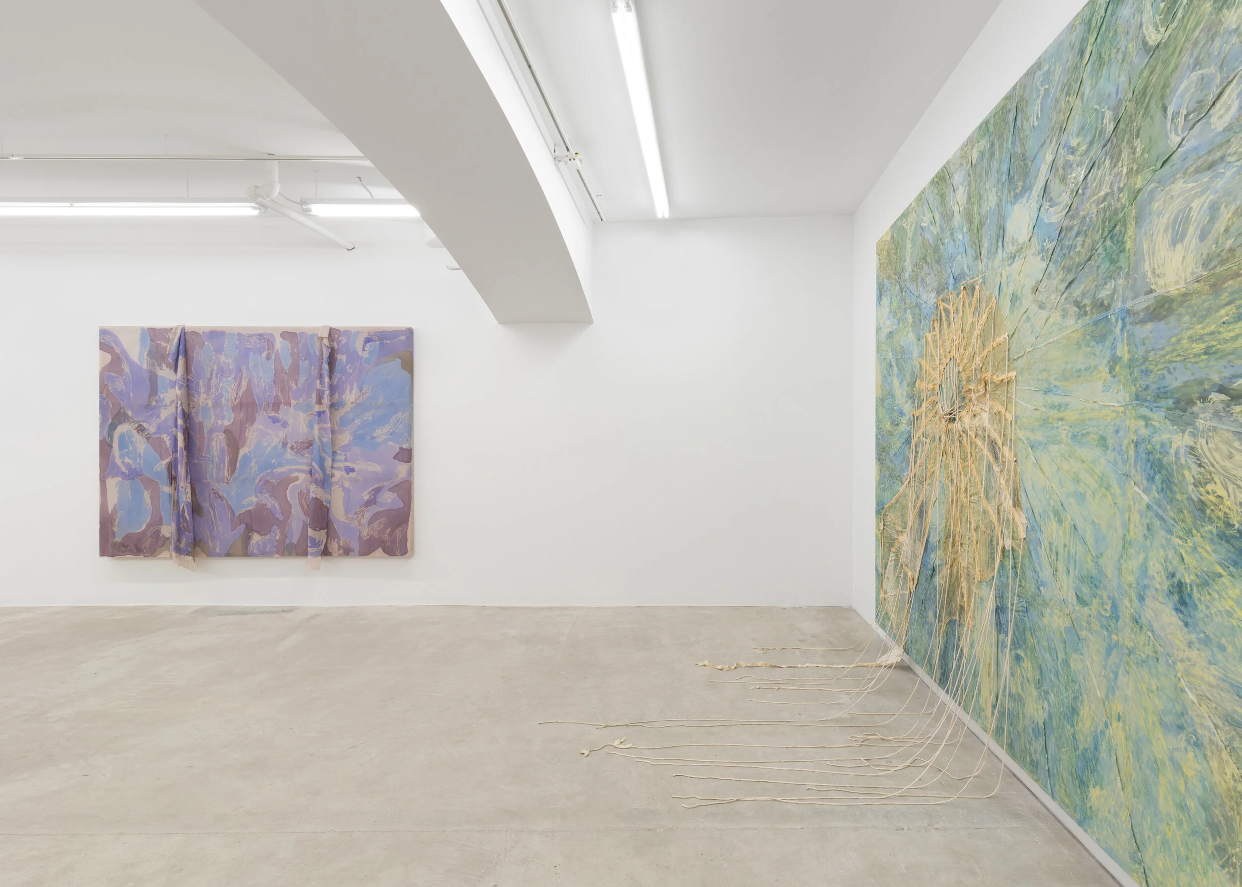 Erica Mahinay, Emergence as our scaffolding?, 2021, oil on canvas and acrylic and pigment on silk, 60 x 96 inches, 152.4 x 243.8 cm