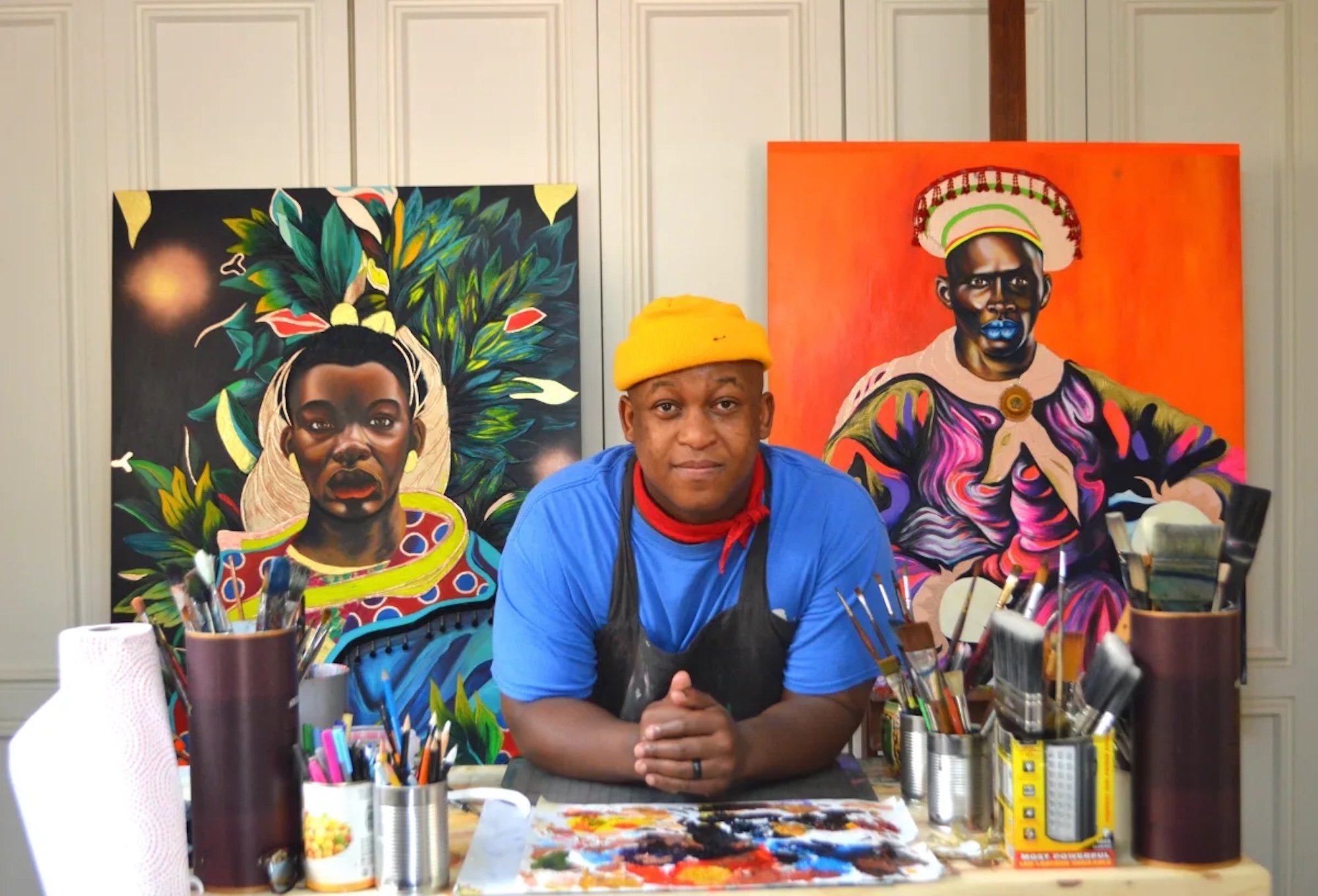 Phumelele Tshabalala (b. 1984, Johannesburg, South Africa) explores the depth and possibility of Black identity in his paintings using oil and acrylic paint. He studied Fine and Applied Arts at Tshwane University of Technology, Pretoria, South Africa (2009), specializing in Printmaking and Painting, and has an MFA in Visual Art from SUNY Purchase College, New York (2016). Exhibitions include Shattered Glass at Jeffrey Deitch, LA, alongside artists including Simphiwe Ndzube, Lauren Halsey and Vincent Valdez (2021); a solo exhibition at Lyles & King, New York (2021), International Print Center, New York (2017); Pjazza Kastilija, Valetta (2017); Momenta Gallery, New York (2016), and Hudson Valley Center for Contemporary Art, New York (2015). Tshabalala has presented artist talks at Neuberger Museum, New York (2016) and Hudson Valley Center of Contemporary Art (2015). Tshabalala (b. 1987, Johannesburg, South Africa) lives and works in Johannesburg, South Africa.