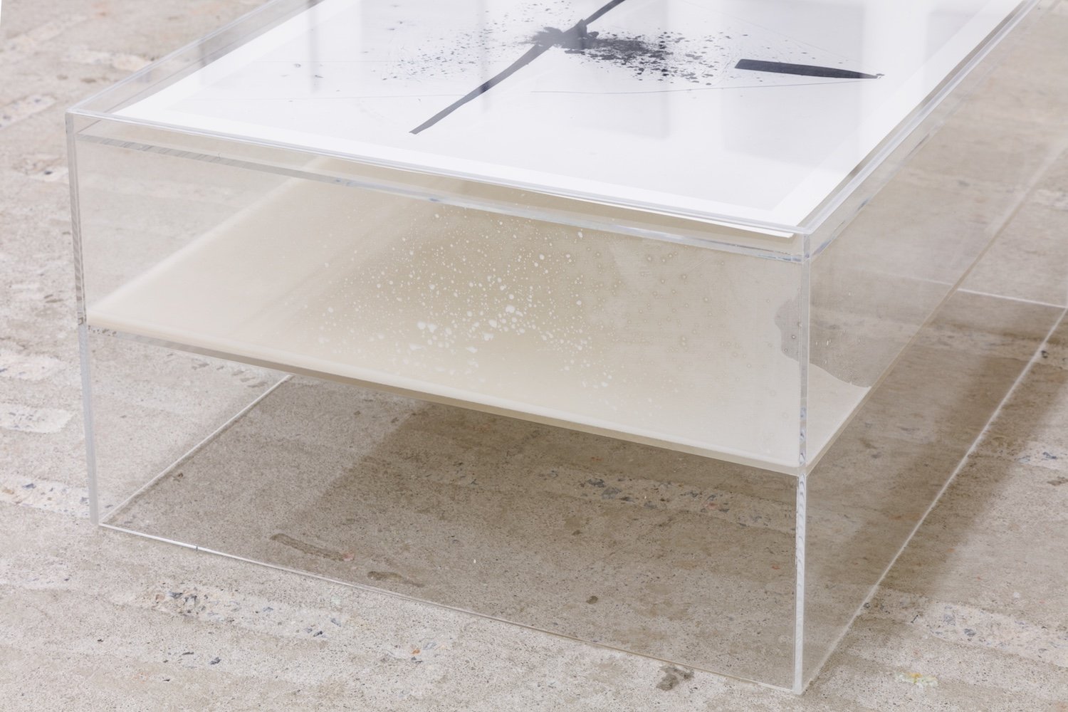 Jo-ey Tang, Container For Bullet Through Glass, 2017, Plexiglass box, macadamia milk, 17 x 21 x 10 inches