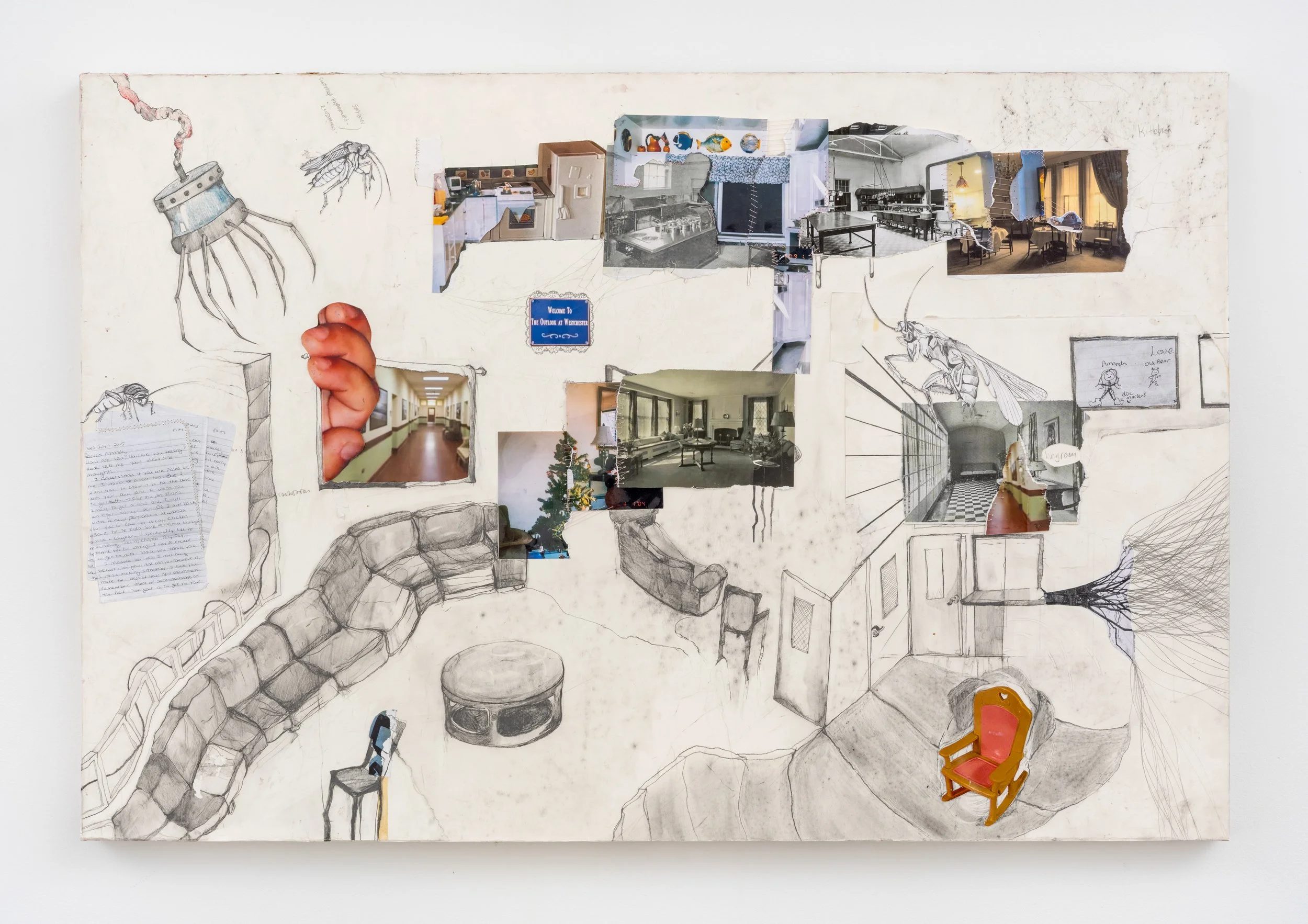 Screen grabs from a video of The Outlook NYP 2010, reproduction of letters from the artists mother, photo of artist's dollhouse and accessories, photos from artist's childhood home, photos of the Bloomingdale Hospital/Westchester Division from New York-Presbyterian/Weill Cornell Medical Center Archives Digital Collection (early 1900’s), thread, graphite, and crayon mounted on panel