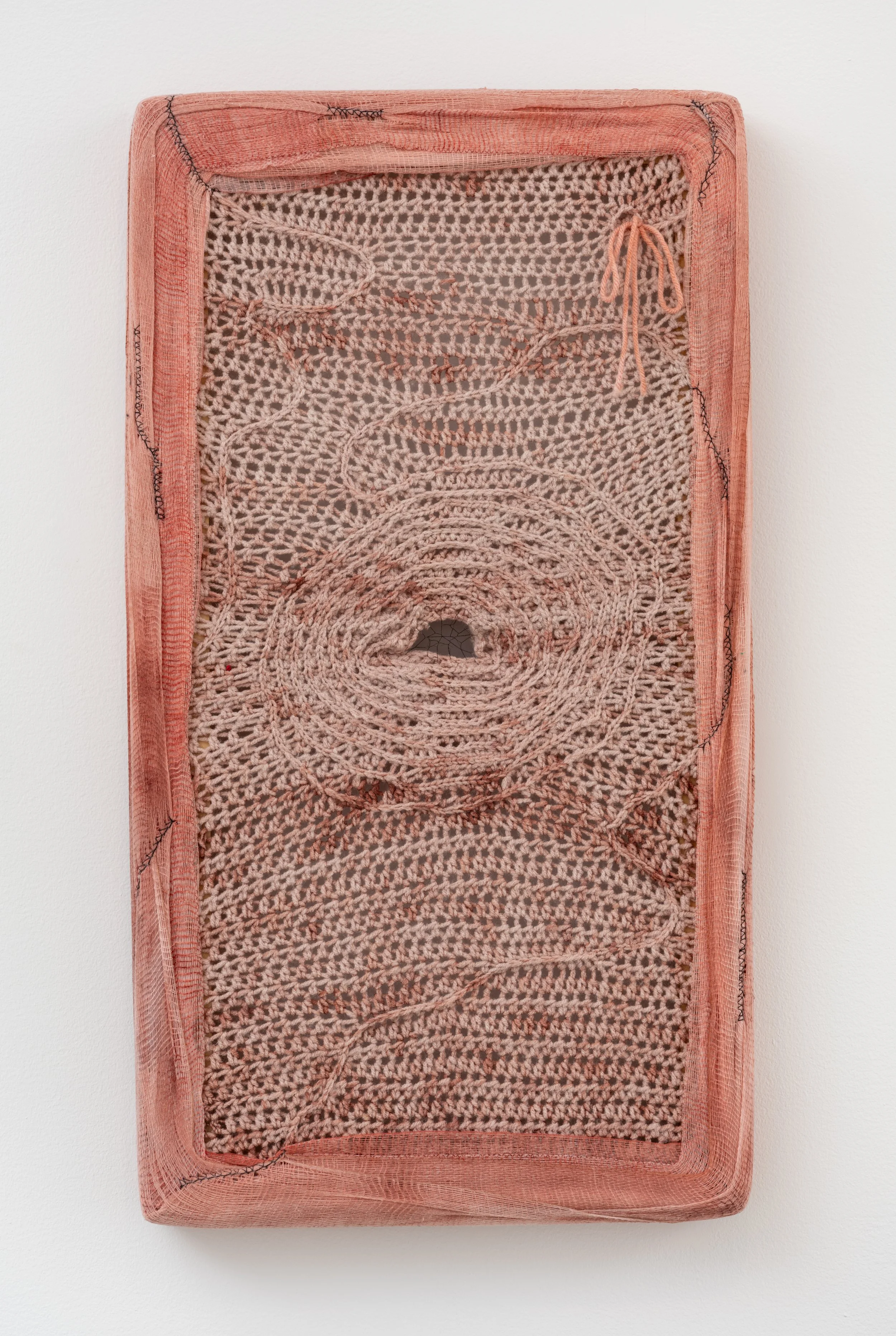 Hand dyed yarn, artists hair, thread, and dyed gauze on stretcher